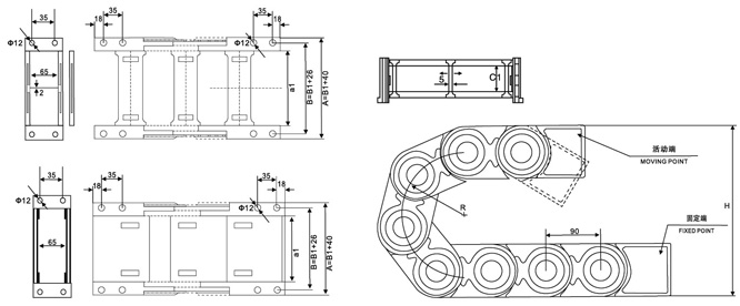 | 型号 | 内腔(高X宽) | 外腔(高X宽) | 弯曲半径(R) | 节距 | 不支撑长度(M) | 型式 |