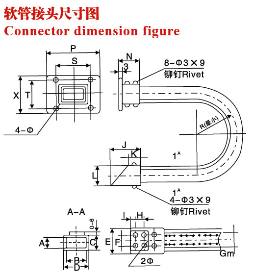 JR-2型矩型金属软管接头尺寸及规格参数表: