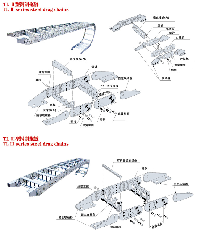 The main body of TL series steel cable carrier consists of chain plates (top quality chromed steel plate), supporting plates (formed aluminum alloy), and pin shaft (alloy steel). The material combination eliminates the relative movement between the cables or rubber hoses and the cable carrier. And there won't be any distortion. The chromed chain plates fealtires in novel appearance, proper structures, enhanced flexibility, reliable strength, invulnerable shape, easy installation and disassembly. The pin shaft is made of high- intensity and wearproof material, alloy copper, wh ic~, promotes the durability and enhances the flexibility. The resistance is lowered, noise reduced. So that there won' t be any deformation or droop after long time use.