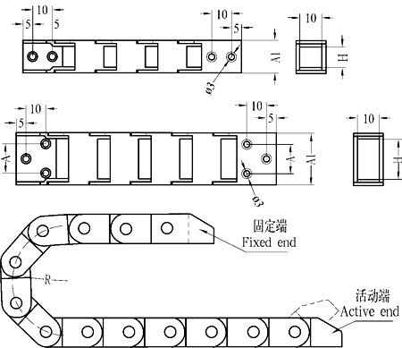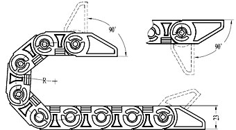 | 型号 | 内腔(高X宽) | 外腔(高X宽) | 弯曲半径(R) | 节距 | 不支撑长度(M) | 型式 |