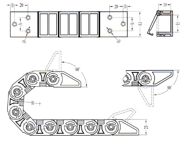 特点:特点:、、不变形、低噪音、装拆灵活、寿命特长。 TP18系列: 型号 内腔(高X宽) 外腔(高X宽) 弯曲半径(R) 节距 不支撑长度(M) 型式 TP18.18 18x18 23x31 28.38.40.48 30 15