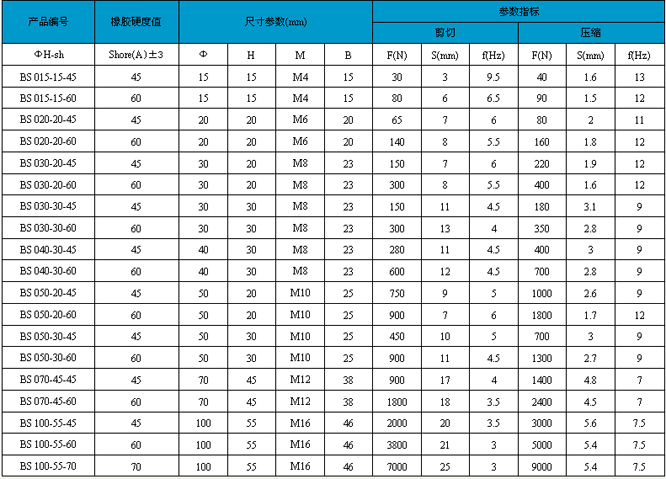 BS减震紧固件产品特点:减振紧固件利用减振橡胶和螺栓,螺母的结合,在动力源及相连部件之间衰减振动,隔离振动,防止因叠加频率,频率相近而产生的振动力放大, 机械的动态条件。